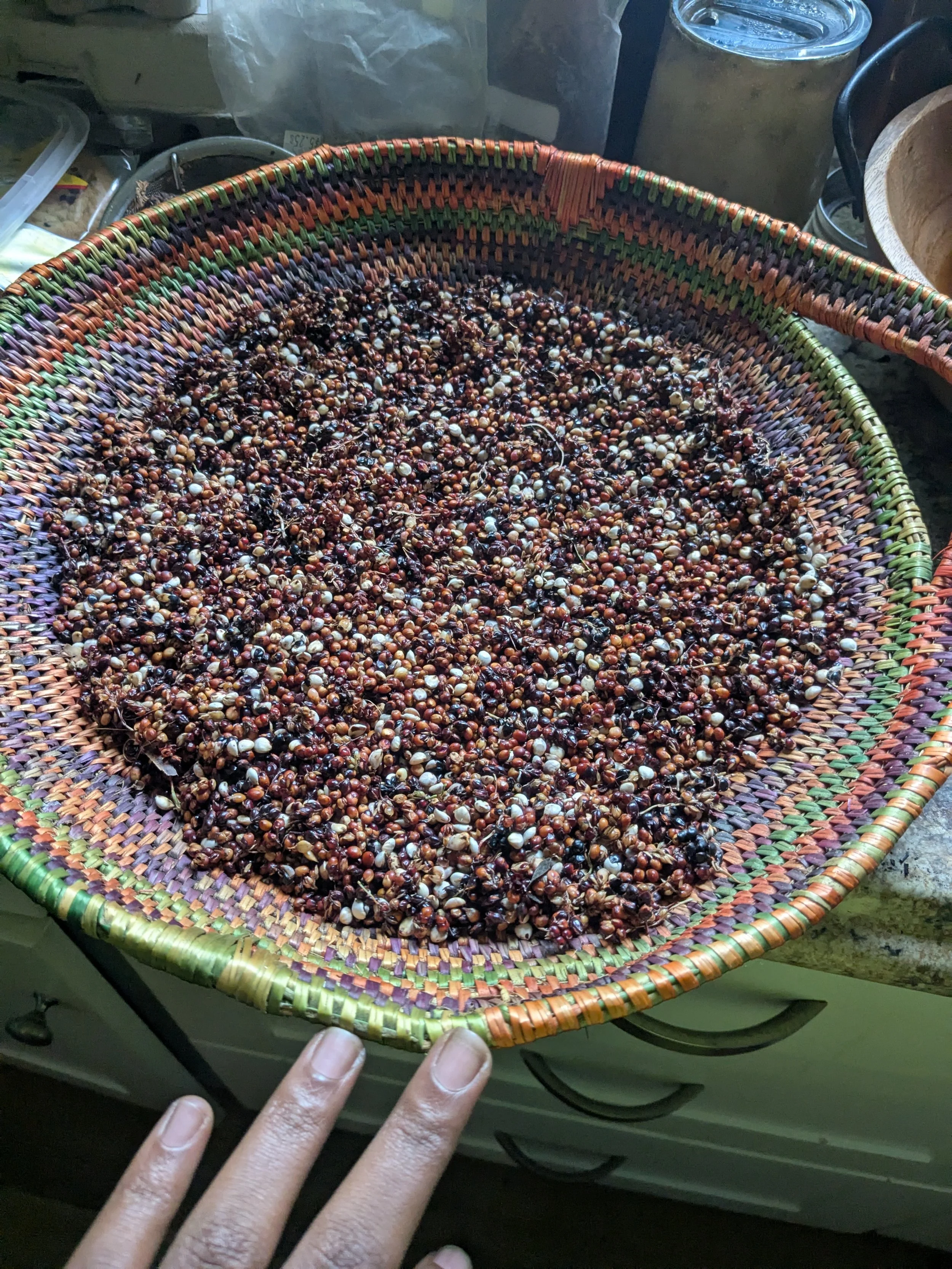 Basket of seeds harvested in this year's field. Half of these were given to Going to Seed to share out, the other half were saved for our planting, and for sharing with our friends.